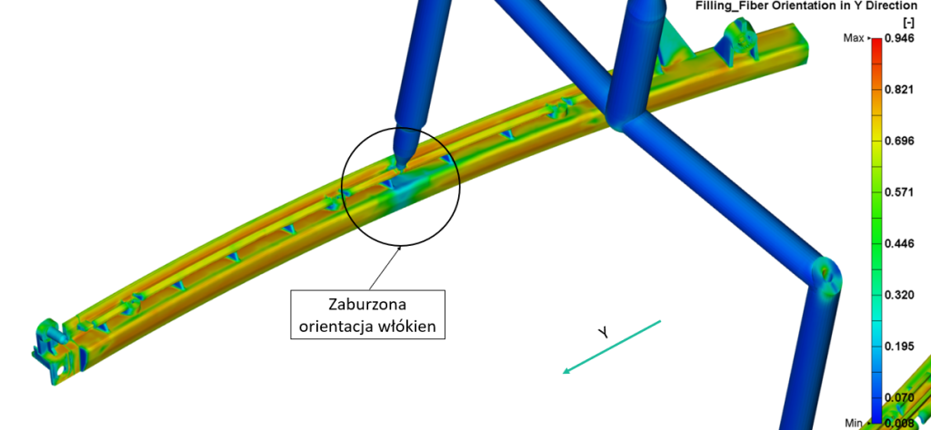 Głównym powodem odkształcenia części jest anizotropia skurczu spowodowana orientacją włókien wynikającą z centralnego położenia punktu wtrysku.