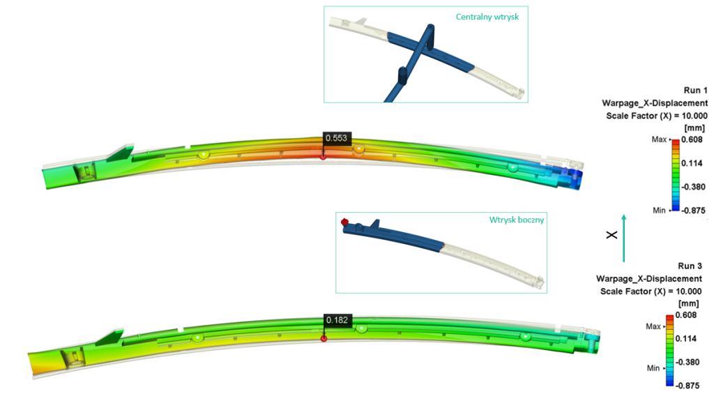 Wyraźnie zmniejszenie deformacji w osi X po zmianie położenia punktu wtrysku.